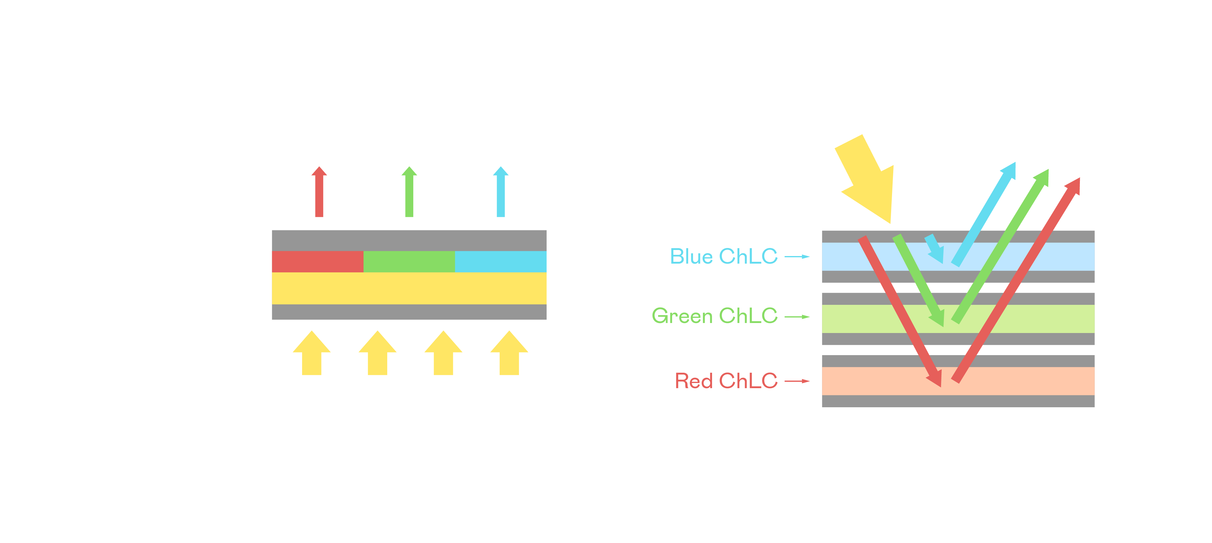EBpay胆固醇液晶显示器是由红、绿、蓝三层胆固醇液晶面板堆叠而成,并采用无彩色滤光片设计,减少环境光在反射过程中的损耗。